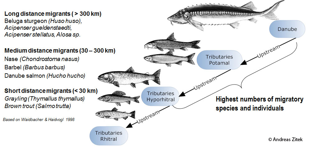 Fig. 1: Typical representatives of migratory guilds classified according to their migration distances along the river continuum.